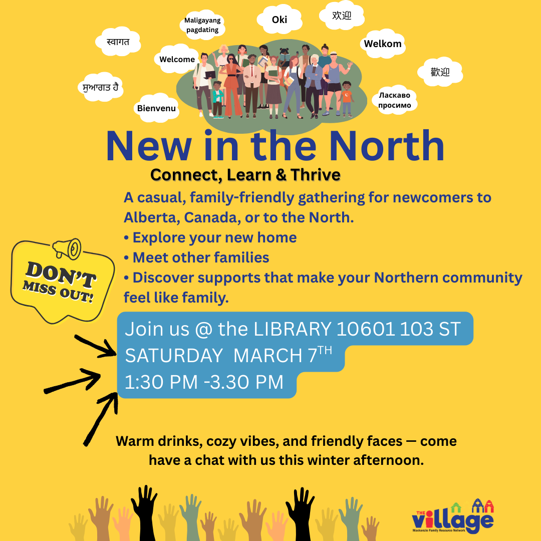 This casual, family-friendly gathering is designed to welcome newcomers to Alberta, Canada, or the North. It offers a relaxed space to connect with others, learn about your new community, and feel supported as you settle into life in the North.