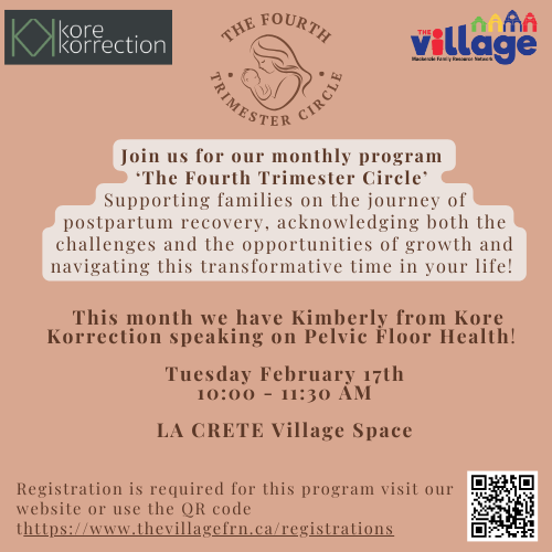 This monthly registered program offers a supportive space for families navigating postpartum recovery. The circle acknowledges both the challenges and the opportunities for growth during the early months after birth, encouraging connection, reflection, and shared learning. Each session features guided discussion and guest speakers to support physical and emotional well-being. This month’s circle includes a special guest from Kore Korrection, sharing information and insight on pelvic floor health in a welcoming and informative setting.